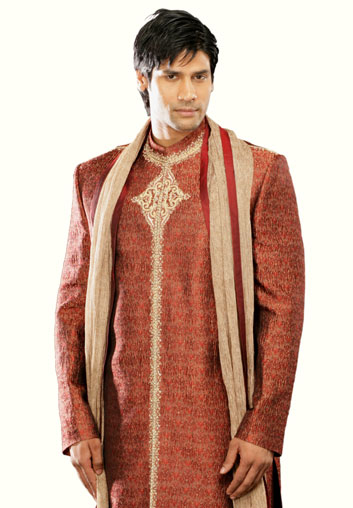 Defined and consists of a simple jacket that runs the length of the knee, and sometimes for longer periods. Designed a unique jacket with the collar like Nehru and buttoned down the front. Sherwani is usually teamed with tight fitting churidar, Jodhpurs, shawl and one or more of the flags of both shoulders. To complete the look royal groom should wear shoes or jooties traditional Indian which are usually available in matching colors.